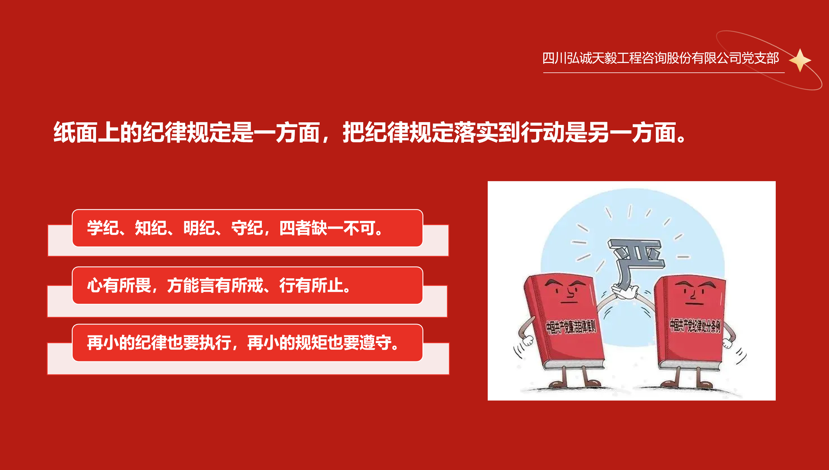 為認真學習貫徹中共中央《關于在全黨開展黨紀學習教育的通知》精神,全面深入推進黨紀學習教育,激勵黨員干部堅守紀律規矩,擔當砥礪前行,更好地發揮基層黨組織戰斗堡壘和黨員干部先鋒模范作用,6月22日,四川弘誠天毅工程咨詢股份有限公司黨支部書記許進同志以“強化使命,嚴守紀律”為題,為全體黨員上了一堂黨紀學習專題黨課。