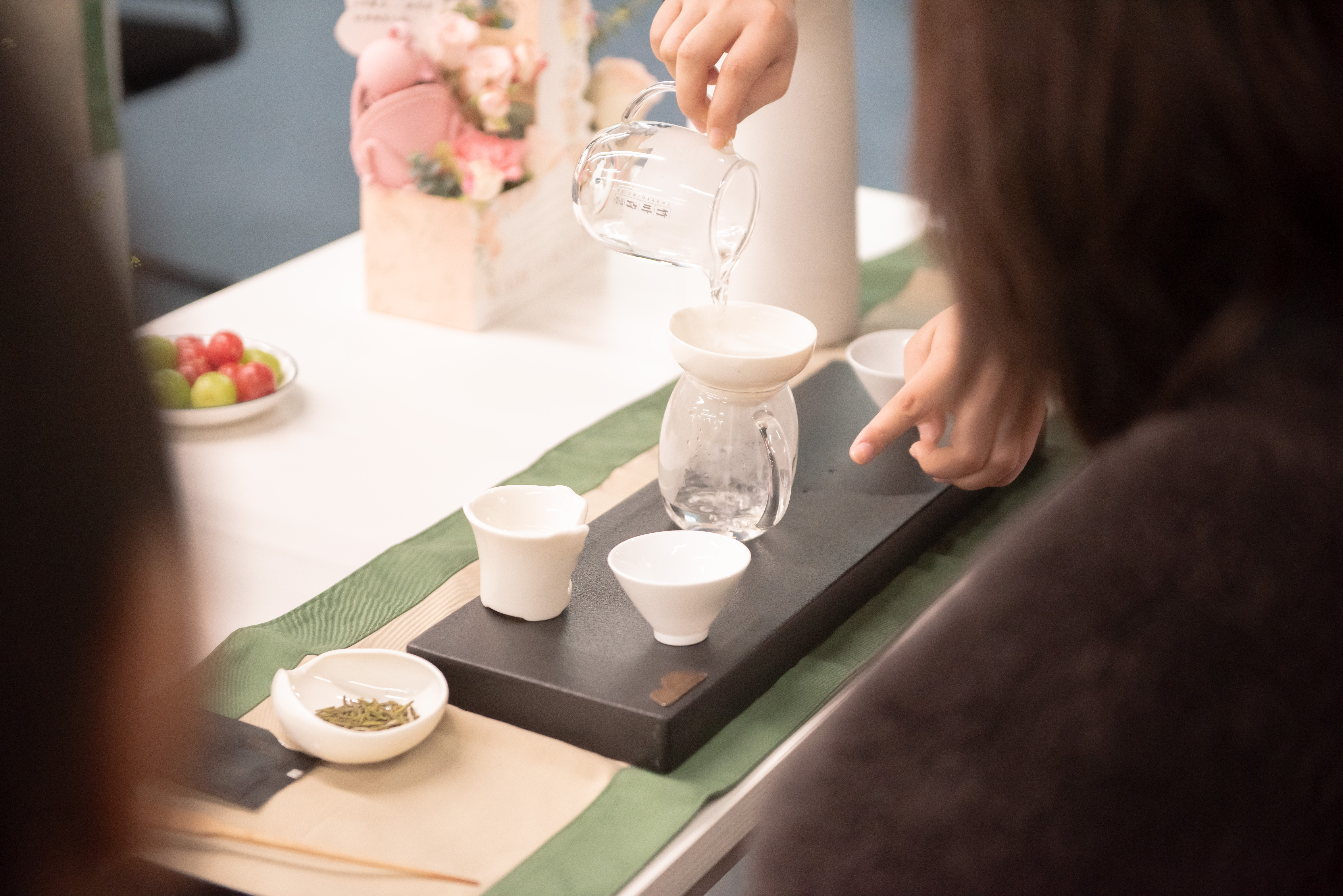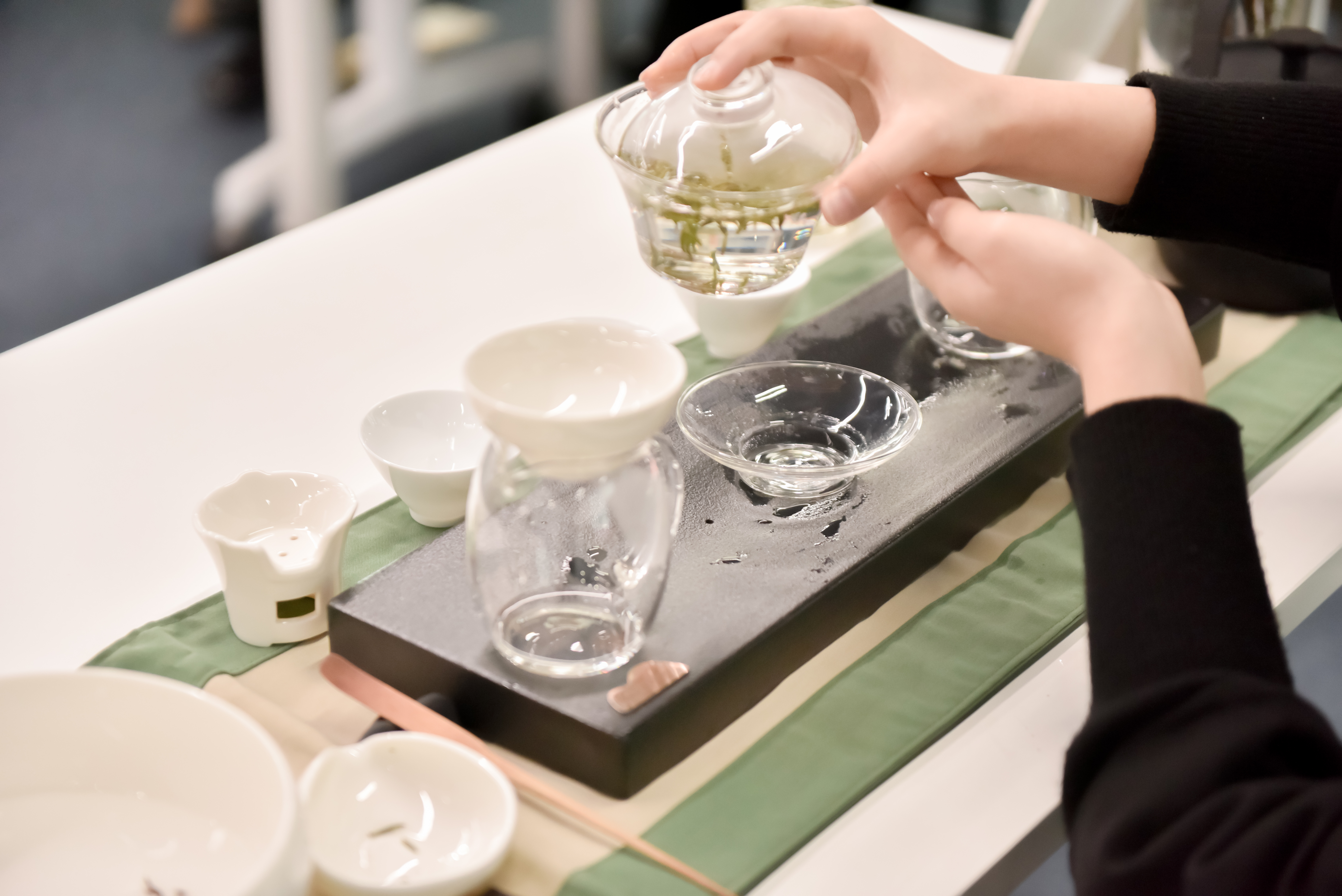 蓋碗杯逆時針畫圓,沸水沖開綠芽銀針如雪落竹林,玻璃杯映著專注眉眼,連茶梗浮沉都成了光陰的故事。